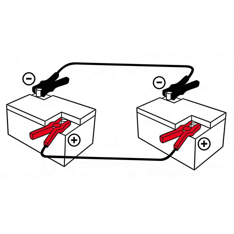 • लाल जंपर क्लॅम्पच्या एका टोकाला जोडासकारात्मक (+) टर्मिनलडिस्चार्ज केलेल्या बॅटरीचे.