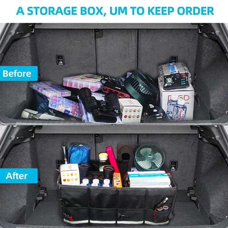 तीन मुख्य कप्पे साधने, अन्न, क्रीडा उपकरणे, क्लीनर आणि आपत्कालीन वस्तू आयोजित करतात. चार जाळीच्या बाजूच्या खिशात टॉवेल किंवा पत्ते यांसारख्या लहान वस्तू असतात. समोर झाकण असलेला खिसा शक्यता आणि शेवट सुरक्षित करतो. हे ट्रक, सेडान, एसयूव्ही, व्हॅन आणि कोणत्याही वाहनाला बसते.
