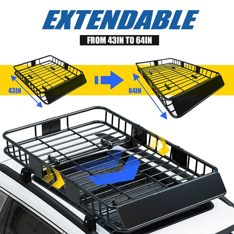 एक्स्टेंडेबल डिझाईन: या रूफ रॅक कॅरियर बास्केटमध्ये चपळ एक्स्टेंडेबल डिझाईन आहे—कॉम्पॅक्ट कारसाठी मानक आकार (43" x 39" x 6") आणि मोठ्या वाहनांसाठी 64" पर्यंत वाढवता येण्याजोगे, जास्तीत जास्त मालवाहू जागा. त्याचा कोलॅप्सिबल फॉर्म वापरला नसताना वेगळे करणे, वाहतूक करणे आणि साठवणे सोपे करते. हे लवचिक प्रवास आणि स्टोरेज गरजांसाठी योग्य आहे.