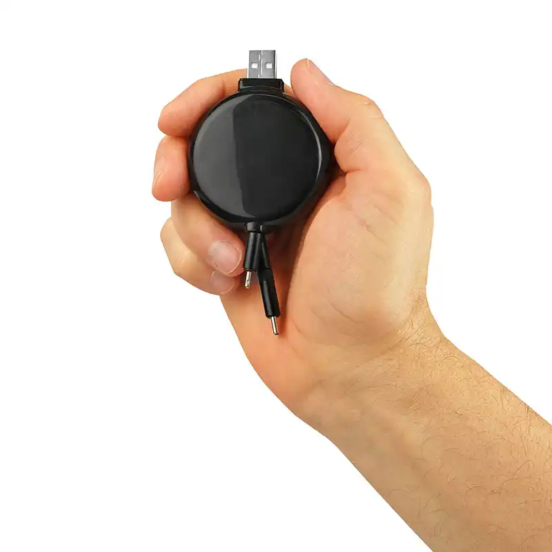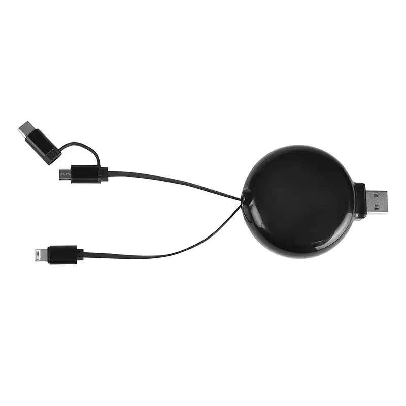 जास्तीत जास्त सुसंगततेसाठी एकाच मागे घेता येण्याजोग्या रीलवर एकात्मिक लाइटनिंग, मायक्रो-USB आणि USB-C कनेक्टर असलेले बहुमुखी 3-इन-1 समाधान.
